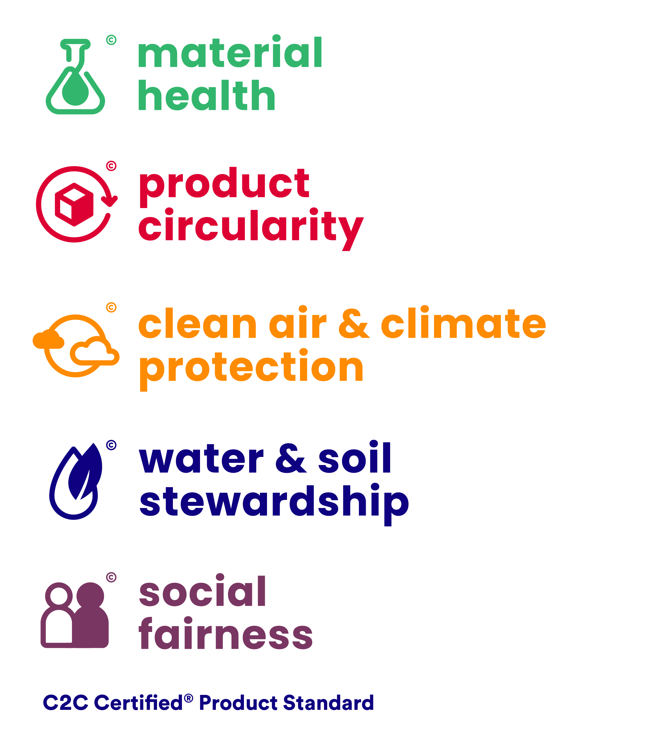 De Cradle to Cradle Certified® Product Standard (Full Scope) biedt het kader om de circulariteit en duurzaamheidsprestaties van materialen en producten in vijf categorieën te beoordelen: